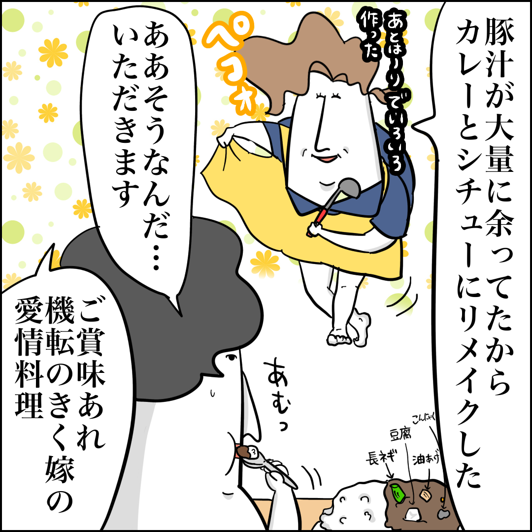リメイクご飯 2023年10月05日 おいしい以外の言葉はいらねぇんだ。(暴君シェフ)豚汁薄めないでカレールー入れちゃったからね〜。(知能0)味見もしてないしね〜。(しろ)シチューも同じようにしょっぱかったです。読んでくださってありがとうございました🥺🙇♀️✨✨!!!🍣夫婦お寿司の乱🍣 🍫チョコレートの乱🍫 💌LINEで読者登録💌 「日常漫画」カテゴリの最新記事 タグ :#まむ#ゆんず < 前の記事次の記事 >